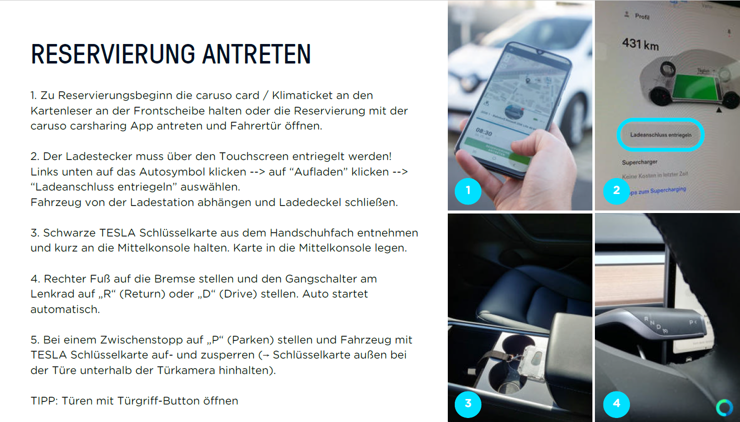 Der Tesla unterscheidet sich in der Handhabung sehr von unseren anderen Fahrzeugen. Hier ein paar Hinweise zur Nutzung: