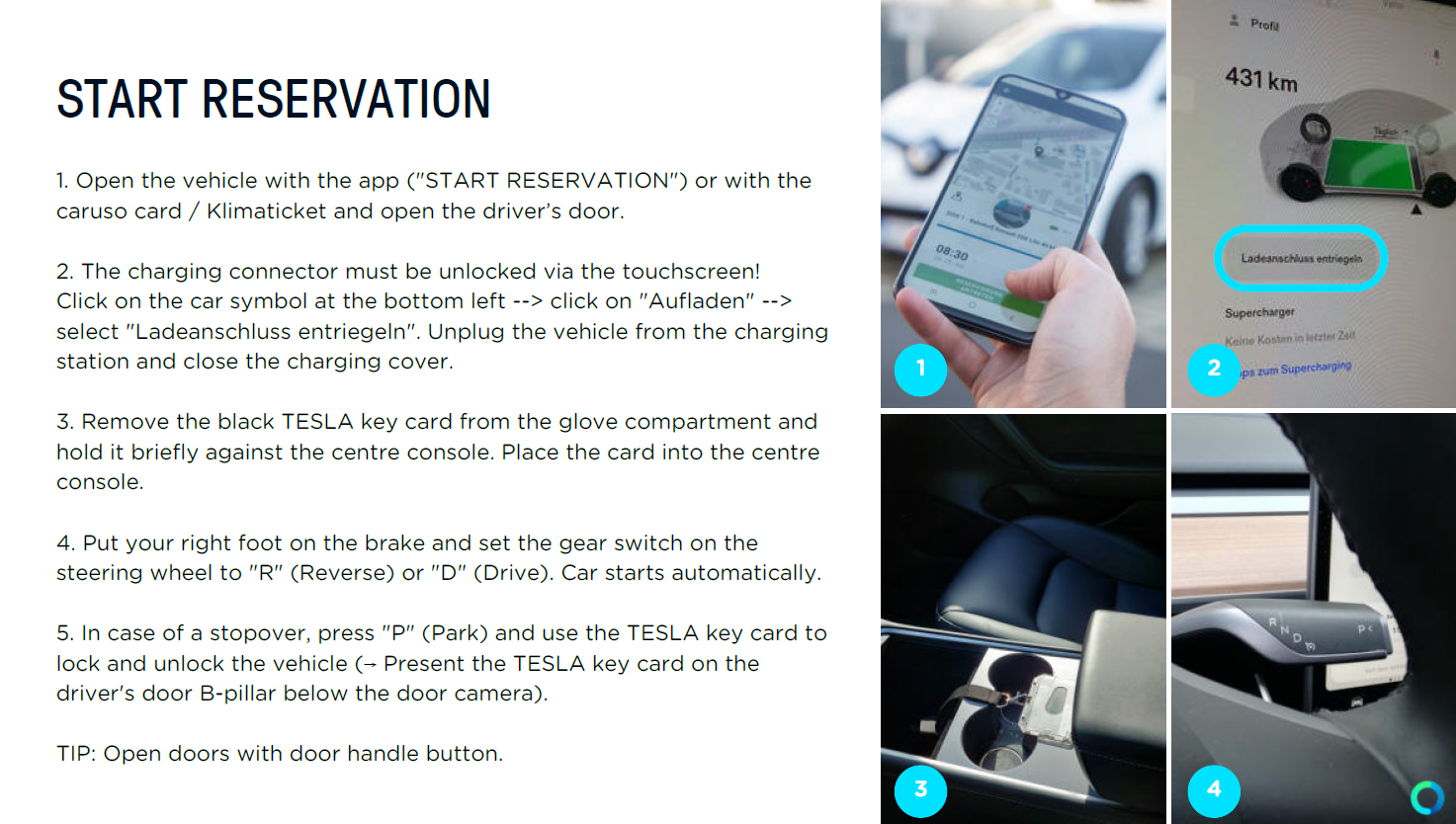 Every now and then the car has to be "woken up" so that the reservation can be started. If the car does not open after you have started the reservation with the app, press the door handle briefly (as if you wanted to open the door). Then wait briefly and try to start the reservation again.